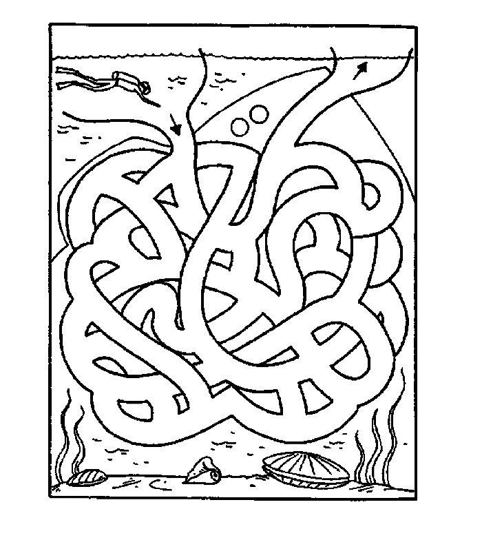 Descriere: Coloreaza drumul pe care trebuie sa-l parcurga scafandrul. El trebuie sa ajunga la suprafata apei.
