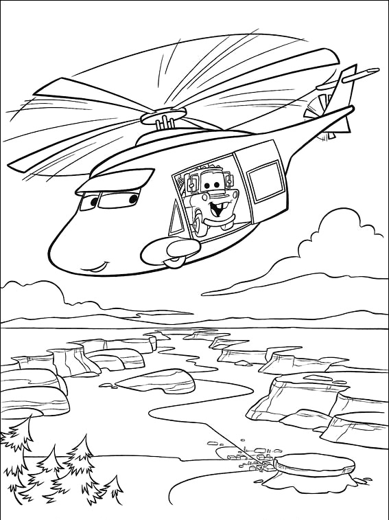 Descriere: Coloreaza-l pe Bucsa care a primit cadou de la Fulger McQueen o plimbare cu elicopterul.