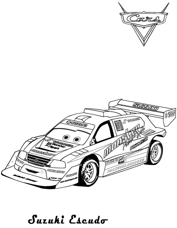 Descriere: Plansa de colorat cu masina Suzuki Escudo din animatia Cars 2 de la Disney.