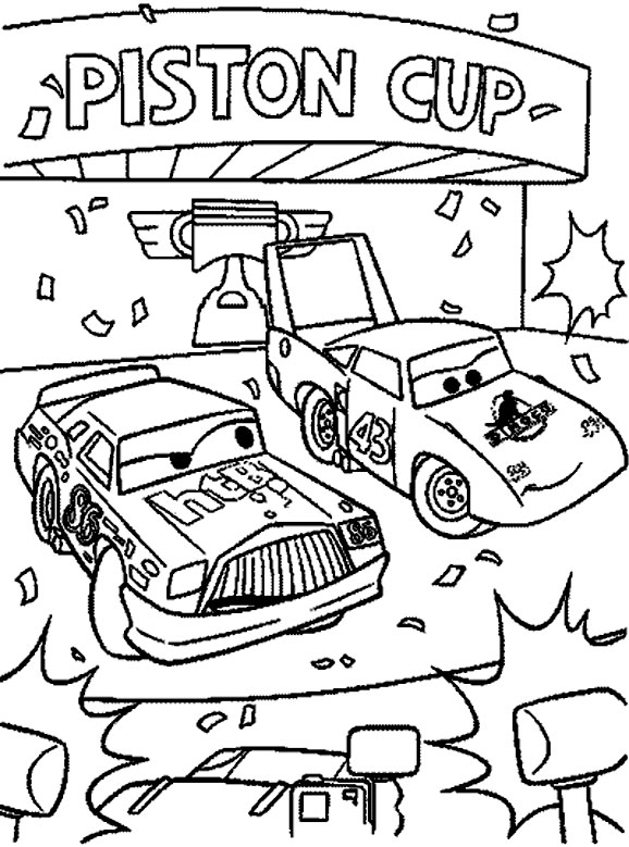 Descriere: Plansa de colorat cu masinile castigatoare din Cupa Piston, Chick Hicks si The King care stau la o sesiune foto.