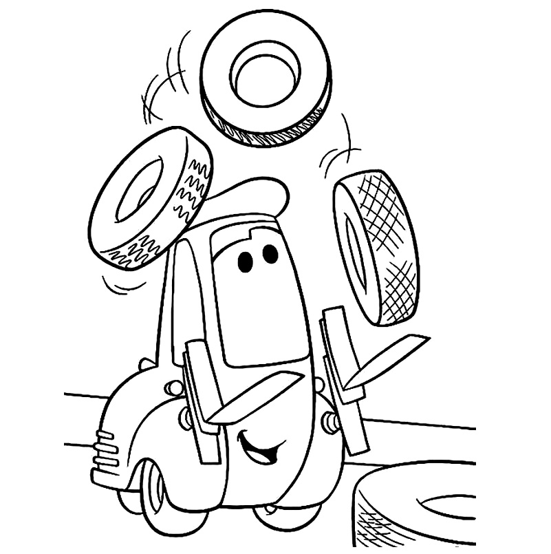 Descriere: Plansa de colorat cu masina Guido care face acrobatii cu rotile.