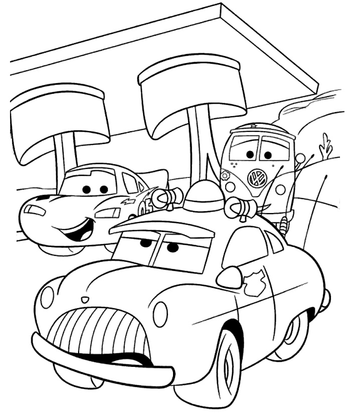 Descriere: Plansa de colorat cu Seriful, Fulger McQueen si Fillmore din desenele animate Cars.
