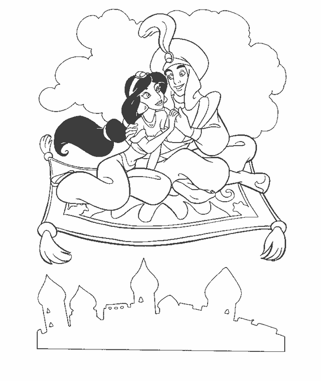 Descriere: Plansa de colorat cu desenele animate Alladin si Jasmine.