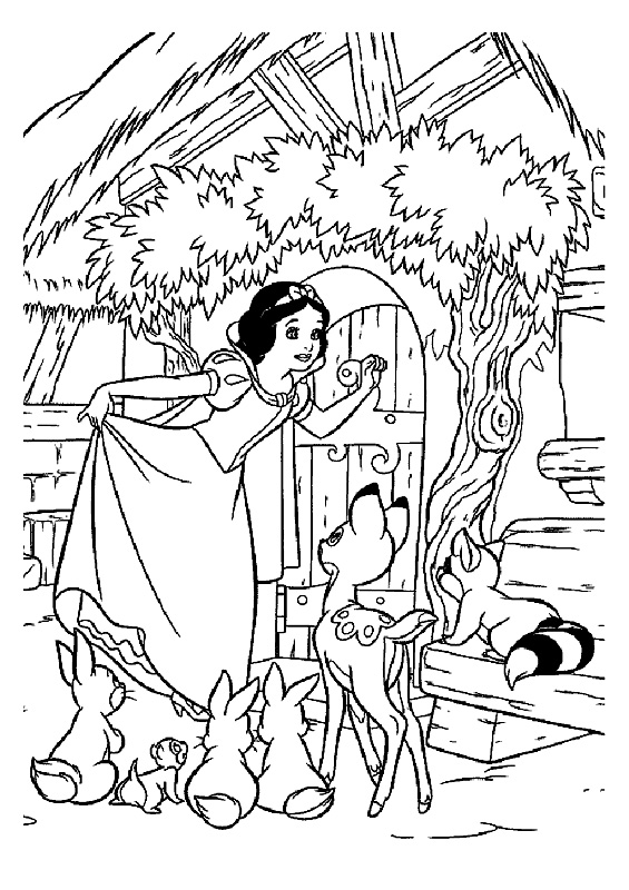 Descriere: Plansa de colorat cu Alba ca Zapada care a ajuns la casa piticilor. Printesa este inconjurata de animalele din padure.