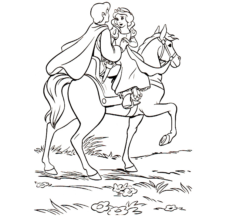 Descriere: Plansa de colorat cu printul care o ia pe Alba ca Zapada pe calul sau si o duce la palat.
