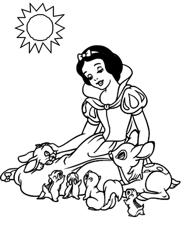 Descriere: Plansa de colorat cu Alba ca Zapada care vorbeste cu animalele din padure.