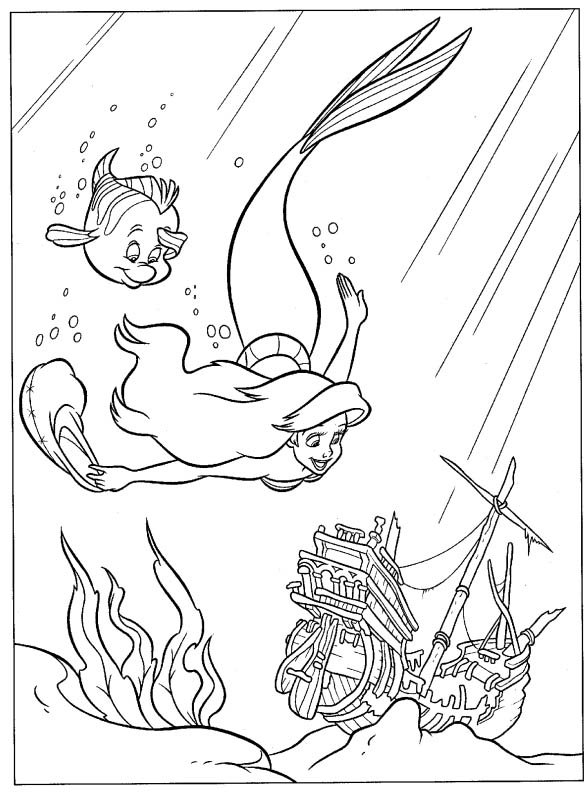 Descriere: Plansa de colorat cu Mica Sirena si pestisorul Flounder care descopera o corabie pe fundul oceanului.