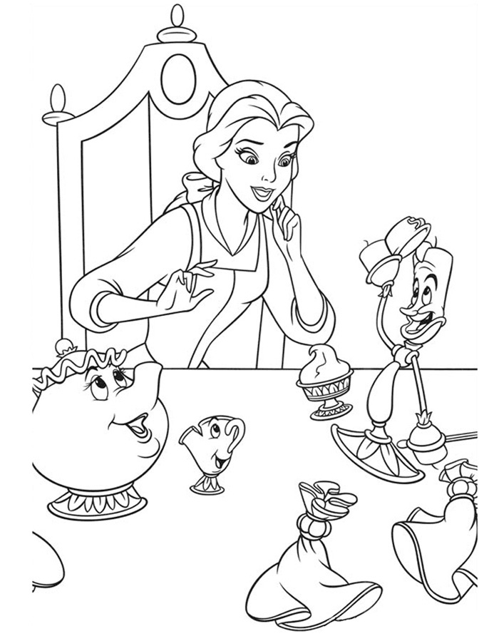 Descriere: Belle de vorba cu Lumiere, Chip Potts si Mrs. Potts. Hai sa-i coloram!