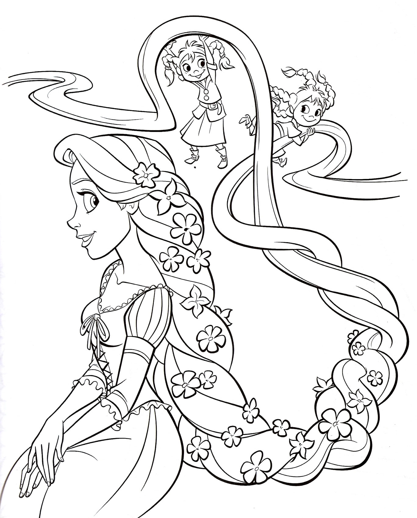 Descriere: Coloreaza plansa cu Rapunzel si copiii care se joaca cu parul sau.