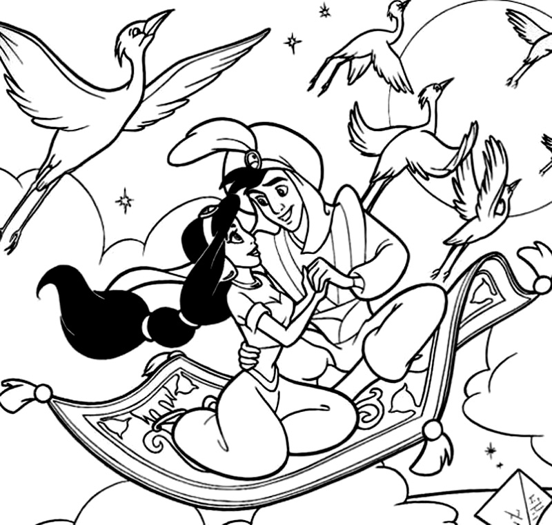 Descriere: Plansa de colorat cu Jasmine si Aladdin care plutesc cu covorul fermecat deasupra norilor printre pasarile cerului.
