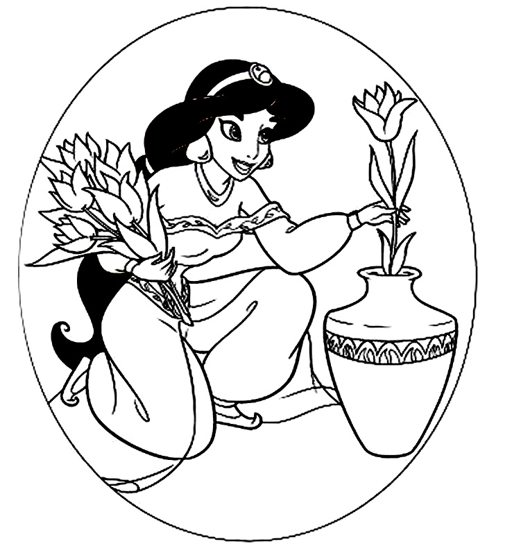 Descriere: Plansa de colorat cu printesa Jasmine care pune lalele in vaza.