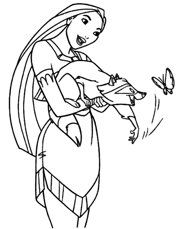 Descriere: Coloreaza plansa cu Pocahontas, bursucul si fluturele.