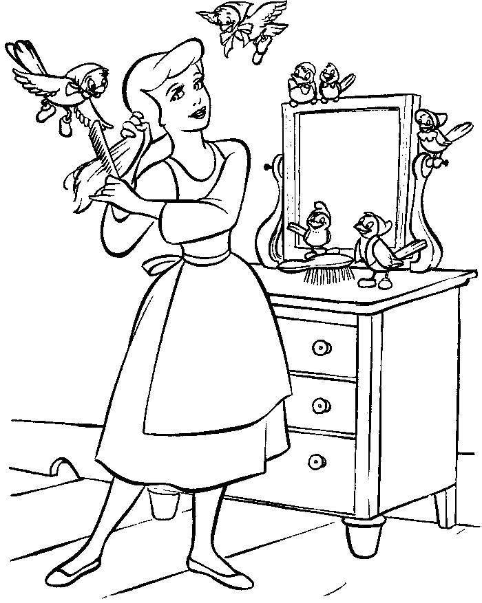 Descriere: Plansa de colorat cu Cenusareasa cand isi aranjeaza parul.