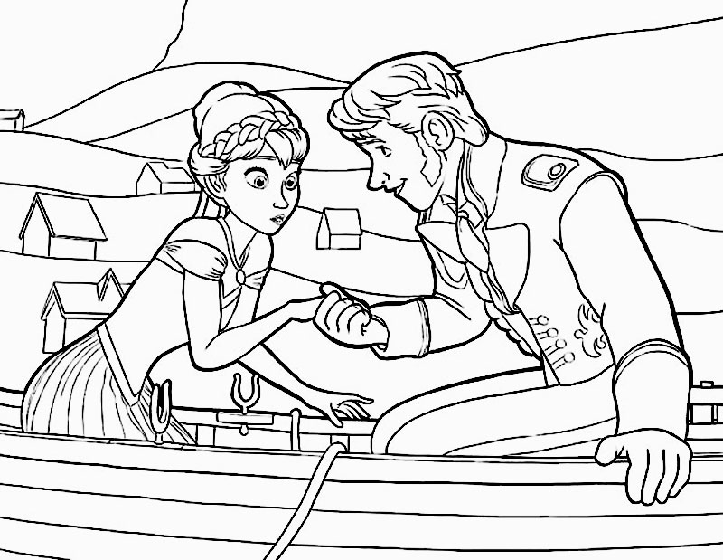 Descriere: Plansa de colorat cu printesa Anna si printul Hans intr-o barca. Scena din animatia Regatul de Gheata.