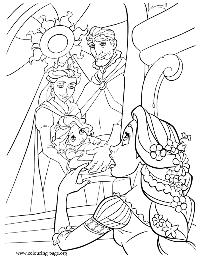 Descriere: Coloreaza plansa cu Rapunzel cand este bebelus inconjurata de rege, regina si diabolica mama Gothel.