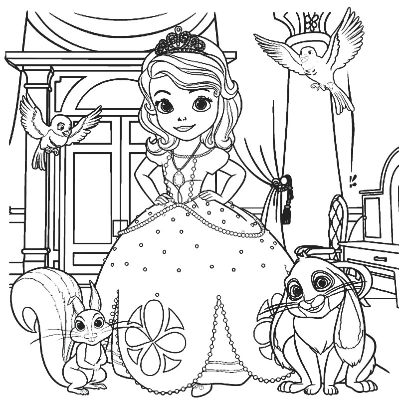 Descriere: Plansa de colorat cu printesa Sofia Intai, pasarile Mia si Robin, iepurasul Clover si veverita Whatnaught.
