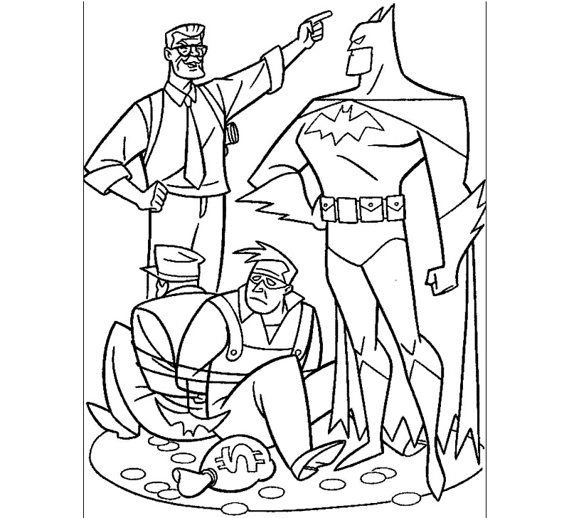 Descriere: Plansa de colorat cu supereroul Batman care a legat banditii si i-a predat comisarului Gordon.