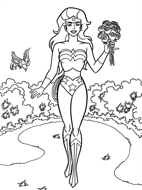 Descriere: Plansa de colorat cu Wonder Woman avand flori de la un admirator.