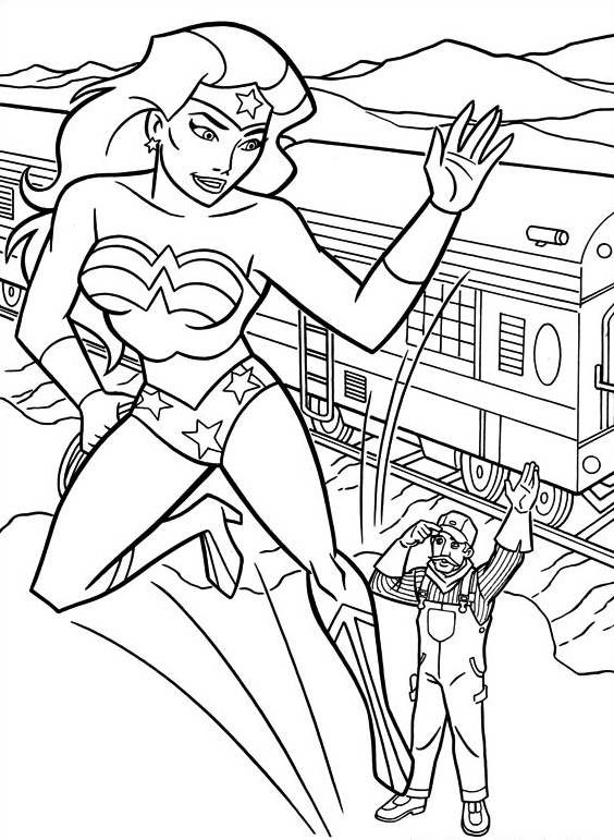 Descriere: Plansa de colorat cu Wonder Woman salutata de mecanicul unui tren.