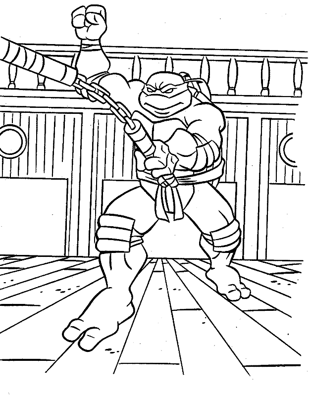 Descriere: Plansa de colorat cu testoasa ninja Michelangelo antrenandu-se cu nunceagul.