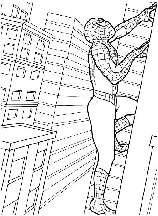 Descriere: Plansa de colorat cu Spiderman catarat pe o cladire.